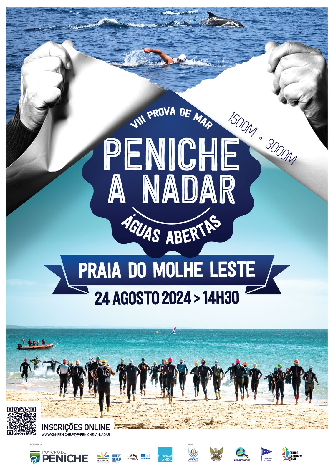 O Município de Peniche, em parceria com a Associação de Natação do Distrito de Leiria, dinamiza a 8.ª Edição da Prova de Águas Abertas "PENICHE a NADAR", no dia 24 de agosto 2024, na Praia do Molhe de Leste.
