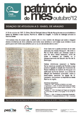 A 19 de outubro comemora-se o 705º aniversário da doação da Vila e Termo de Atouguia à Rainha Santa Isabel e o Município de Peniche destaca essa efeméride associando à iniciativa “Património do Mês” uma Palestra de Fernando Engenheiro sobre a relação da Rainha Santa com o concelho de Peniche.