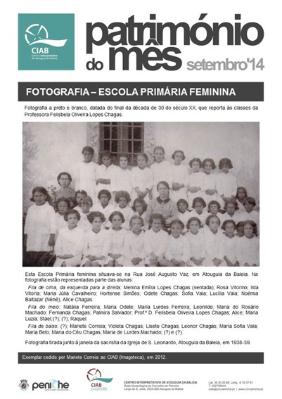 Em mês de regresso às aulas, o Centro Interpretativo de Atouguia da Baleia coloca em evidência, no Boletim Informativo "Património do Mês" de setembro, uma antiga fotografia onde estão representadas a Prof. Felisbela Oliveira Lopes Chagas e parte das suas alunas da antiga Escola Primária feminina de Atouguia da Baleia.