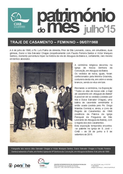 Um fato usado por Francisco Leonardo no seu casamento com Mariana do Penteado Martins, há 110 anos, e dois vestidos, iguais, envergados pelas gémeas Ilda e Dulce Chagas, nos seus casamentos a 6 de julho de 1968, são os Patrimónios do Mês de junho e julho, respetivamente. Estes são dois exemplos de peças patentes ao público na Exposição “Todos os dias da nossa vida: o traje de casamento em Atouguia da Baleia”, no Centro Interpretativo de Atouguia da Baleia, até 5 de setembro de 2015.