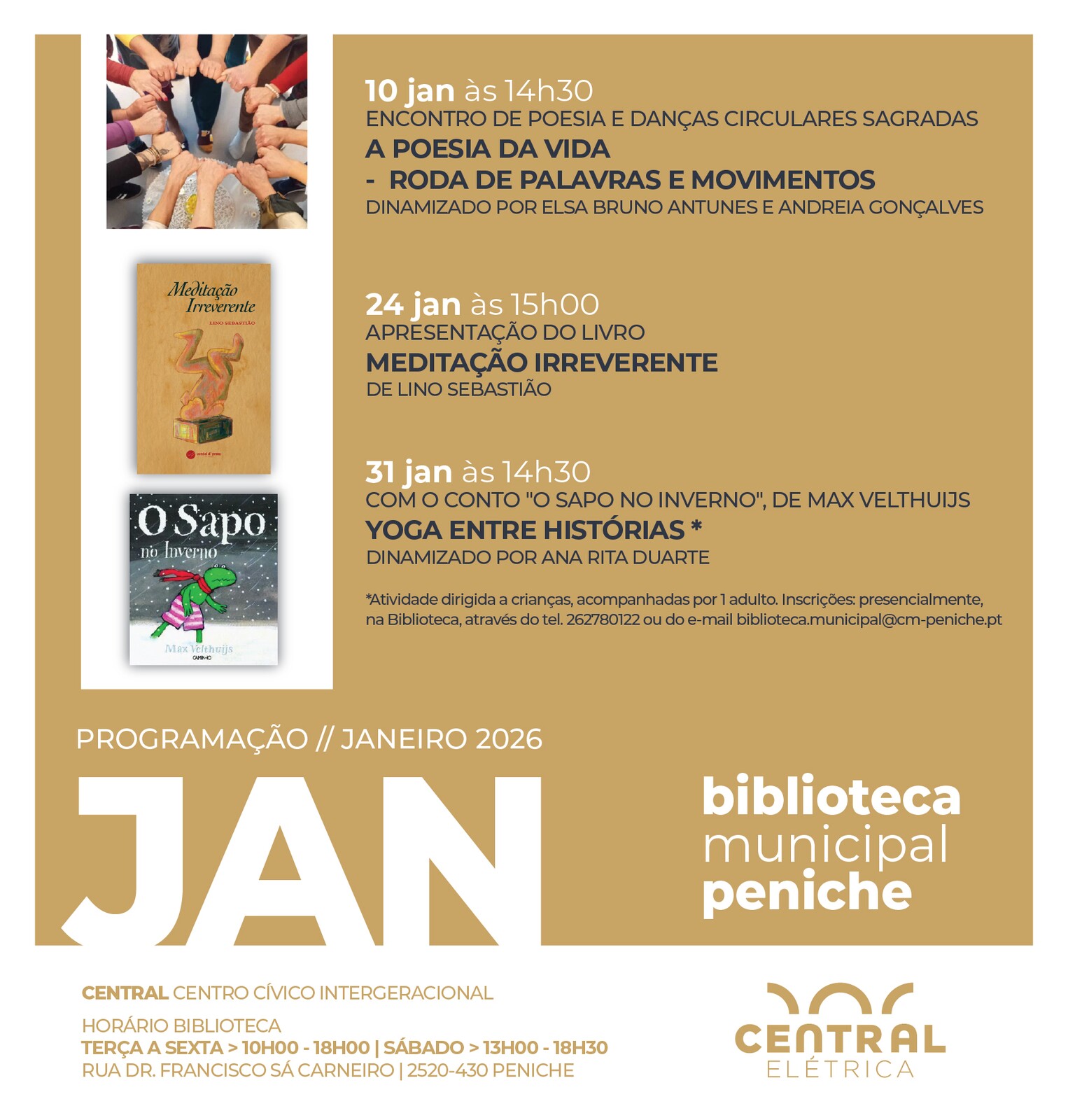 Adicionar a calendário2026-01-10 14:30:002026-01-31 17:00:00Europe/LisbonBiblioteca Municipal | Programação JANEIRO 2026Biblioteca Municipal | Central Elétrica - Centro Cívico Intergeracional Professor Rogério Cação