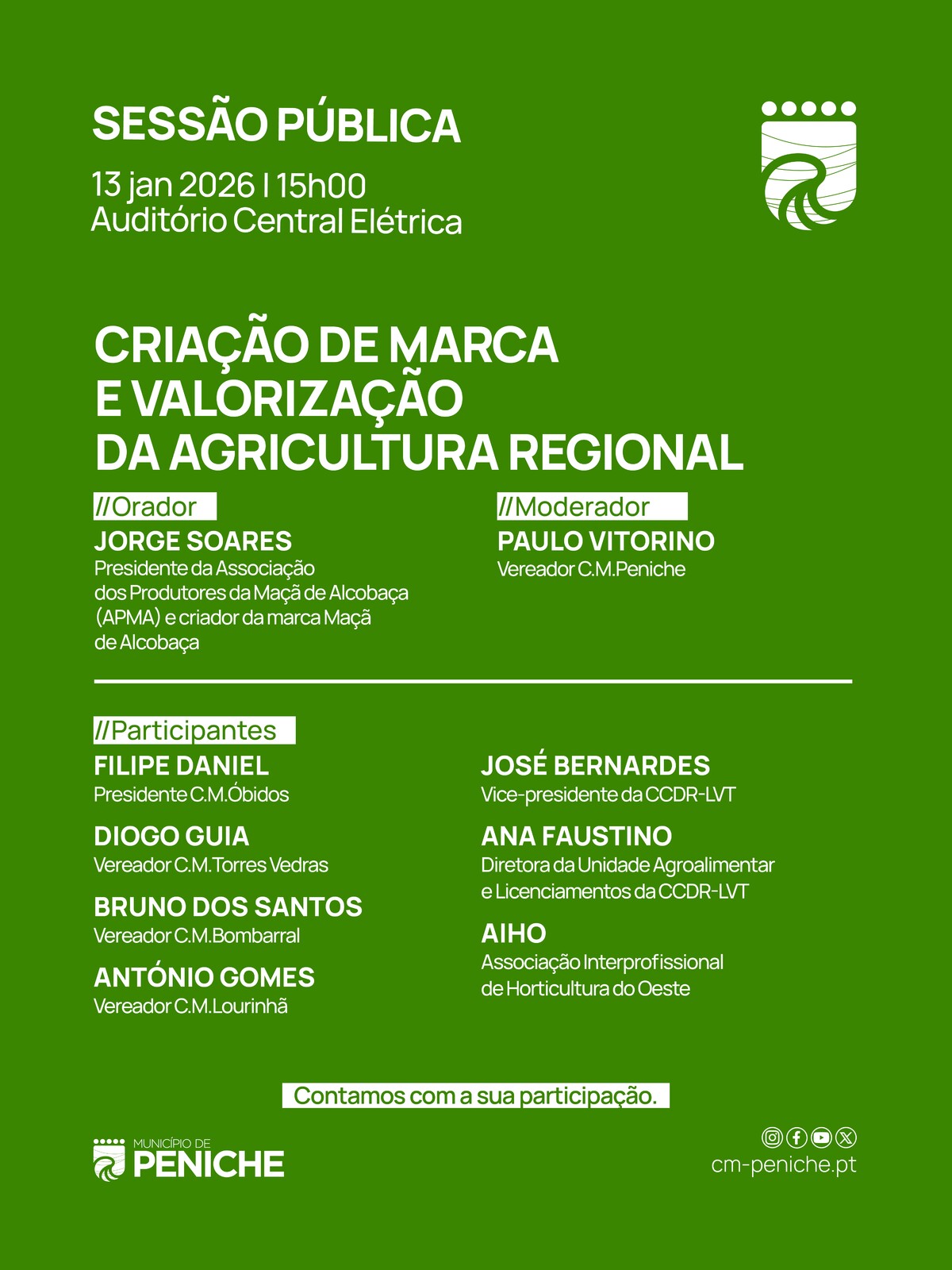 Adicionar a calendário2026-01-13 15:00:002026-01-13 15:00:00Europe/LisbonSessão Pública "Criação de Marca e Valorização da Agricultura Regional"Auditório do Centro Cívico e Intergeracional Professor Rogério Cação