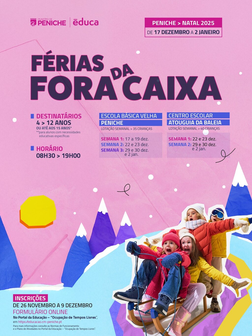 As Férias Fora da Caixa são um Serviço Municipal de Ocupação de Tempos Livres, de caráter lúdico, cultural e desportivo. Nestas férias da Natal decorrerá de17 dezembro 2025 a 02 janeiro 2026, na Escola Básica Velha de Peniche e no Centro Escolar de Atouguia da Baleia.