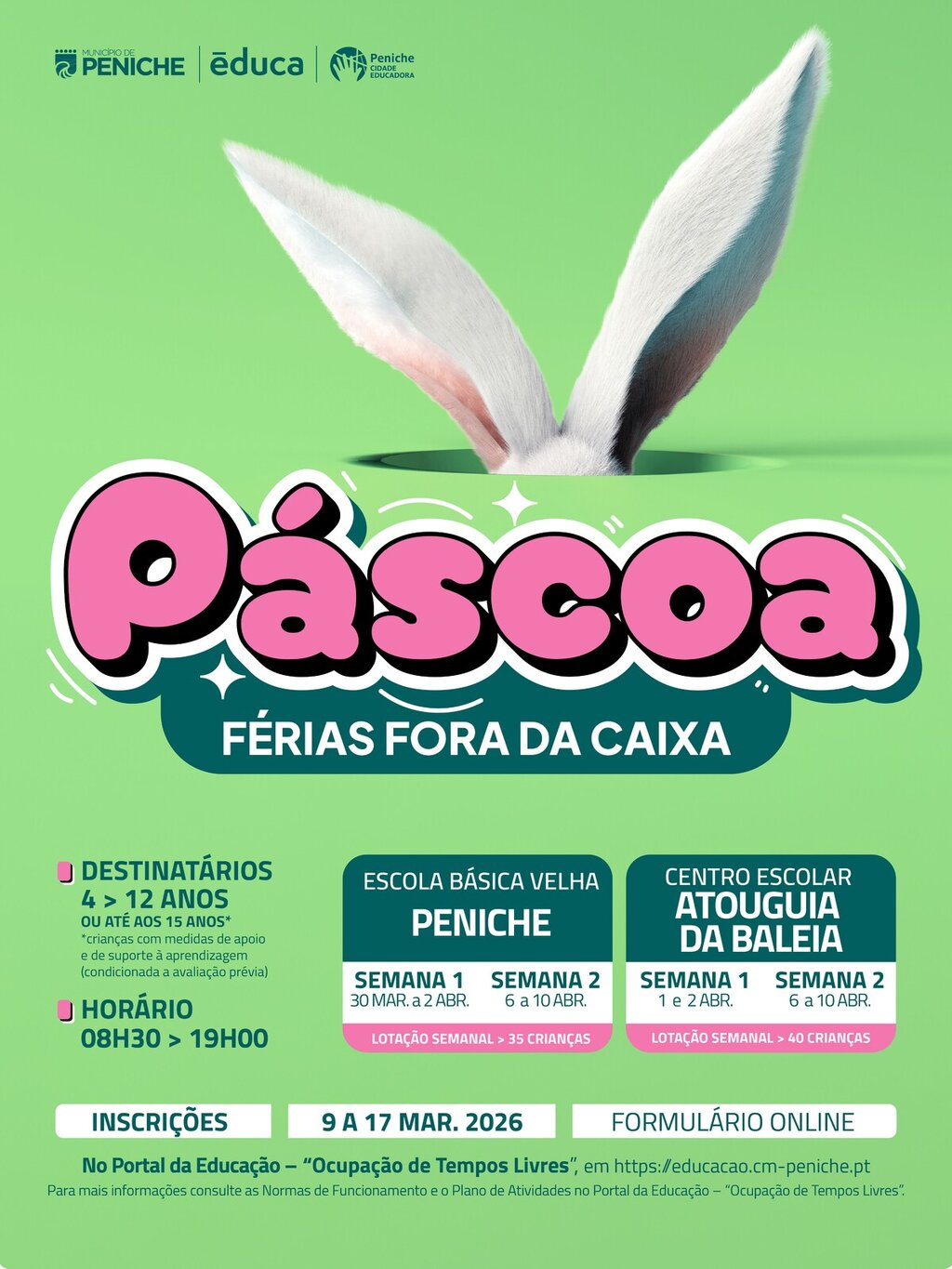 As Férias Fora da Caixa são um Serviço Municipal de Ocupação de Tempos Livres, de caráter lúdico, cultural e desportivo. Nestas férias da Páscoa decorrerá de30 março a 10 de abril 2026, na Escola Básica Velha de Peniche e no Centro Escolar de Atouguia da Baleia.